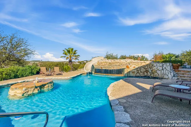 Situated on a private one acre greenbelt lot with views for miles in the 24 hour guard gated luxury community of Summerglen, this five-bedroom residence is all about lifestyle, privacy, and incredible "bones." The heart of the home is a huge family room with soaring ceilings, a wet bar, and massive windows that bring in tons of natural light, flowing right into a spacious kitchen equipped with gas cooking, stainless steel appliances, double ovens, refrigerator, Silestone countertops, walk-in pantry, and a cozy breakfast area overlooking the beautiful pool. With four bedrooms on the main floor including a Jack & Jill setup, and a versatile fifth bedroom (perfect for a private study) and game room upstairs, the footprint is exactly what you want for easy living. The primary suite is a true retreat with an updated bathroom including an oversized walk-in shower and a generous walk-in closet with custom shelving. Additional highlights include, new carpet in 2025, wood-like tile flooring, spacious bedrooms and closets, 3 HVAC systems, washing machine, dryer, water softener, solar screens, gutters, a water heater approximately three years old, circular drive, three attic access points, a 2.5 car garage for additional storage, and so much more! The lifestyle offered is next-level: you've got a saltwater pool with a swim-up bar and waterslide, a lighted sports court for night games, a fire pit, large covered patio, and an outdoor grill station. This resort style setting offers fun, relaxation, and an elevated lifestyle, along with the opportunity to personalize the finishes and add value in a premier neighborhood with award winning NEISD schools and no city taxes. After years of construction, HWY 281 is now open northbound & southbound making the drive to and from 1604 quick & easy. Conveniently located close to JW Marriott's TPC golf course, San Antonio airport, Stone Oak shopping, & dining, hospitals, and major employers. WELCOME HOME!